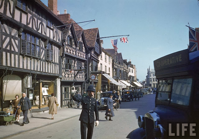 Brit és amerikai lobogó az utca felett, lent Shakespeare születésnapi ünnepségére készülnek, amerikai katonazenekar szereplésével.