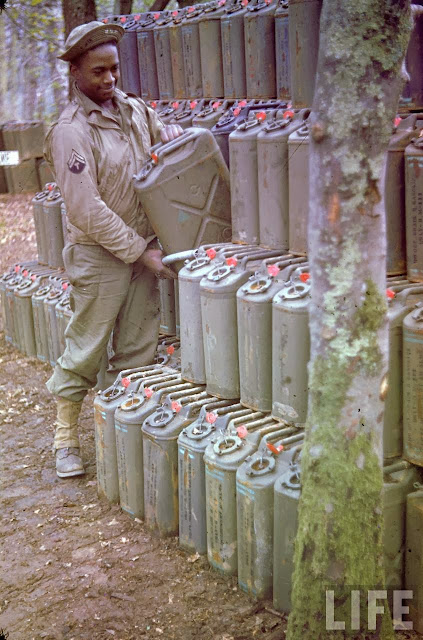 Afro-amerikai katona üzemanyag kannákat készít elő a D-napi invázióhoz.